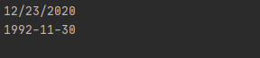 package JavaStudy; import java.time.*; import java.time.format.DateTimeFormatter; import java.time.temporal.ChronoUnit; public class Main { public static void main(String[] args) { LocalDate today = LocalDate.now(); DateTimeFormatter MMddyyyy = DateTimeFormatter.ofPattern("MM/dd/yyyy"); System.out.println(today.format(MMddyyyy)); LocalDate parse = LocalDate.parse("11/30/1992", MMddyyyy); System.out.println(parse); } }