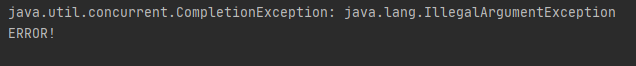 에러인 경우의 출력 package Java8; import java.util.concurrent.*; public class Main { public static void main(String[] args) throws ExecutionException, InterruptedException { boolean throwError = false; CompletableFuture<String> hello = CompletableFuture.supplyAsync(() -> { if (throwError) { throw new IllegalArgumentException(); } System.out.println("Hello : " + Thread.currentThread().getName()); return "Hello"; }).handle((result, ex) -> { if (ex != null) { System.out.println(ex); return "ERROR!"; } return result; }); System.out.println(hello.get()); } }