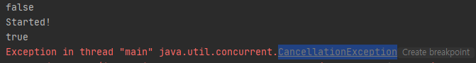 작업이 완료되지 않고 cancel에 의해 작업이 취소되어 종료된 것이기 때문에, 작업이 isDone()인 것은 true지만, get()을 통해 완료된 작업을 가져올 순 없다. 따라서 작업을 가져오려하면 CancellationException이 발생한다.