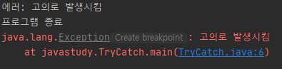 위의 예제에서 try블럭안에 예외가 발생하지 않았기 때문에 catch블럭의 문장이 실행되지 않은 것을 확인할 수 있따. 예제를 변경해서 try블럭에서 예외가 발생하도록 하면 아래와 같다.