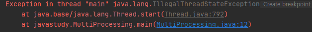 만약 위의 예제에서 t1을 한 번더 실행하게 되면 아래와 같이 IllegalThreadStateException이 발생한다.