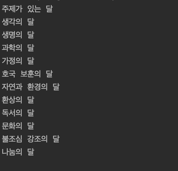 "January", "February" 등 일반 문자열을 출력하는 것과 같은 기능이지만, 어떻게 구현했는지가 다르다.