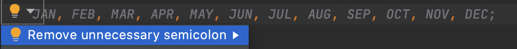 enum Month { JAN, FEB, MAR, APR, MAY, JUN, JUL, AUG, SEP, OCT, NOV, DEC; } public class MonthClass { public static void main(String[] args) { Month jan = Month.JAN; System.out.println(jan); } }몇몇 블로그에서 ;(세미콜론)은 생략할 수 없고 반드시 사용해야 한다는 것을 봤는데 이는 잘못된 사실이다. 상수로 사용할 목록만 정의하는 경우 세미콜론은 생략 가능하고 실제로 인텔리제이에서 세미콜론을 붙여봤는데 아래와 같이 불필요한 세미콜론을 제거할 것을 추천했다.