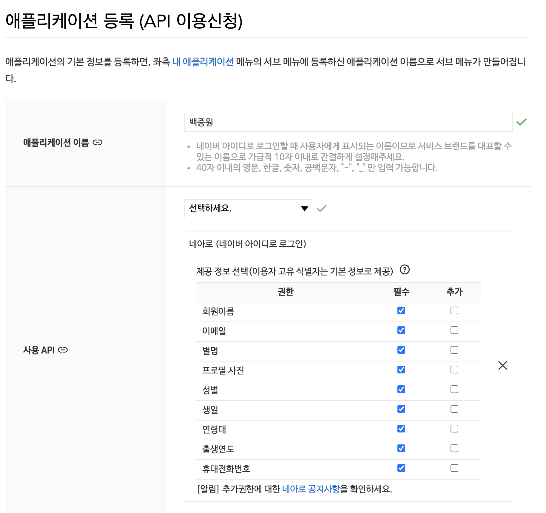 네이버로부터 제공받고자 하는 사용자 정보를 필수, 추가 설정으로 받아올 수 있다.