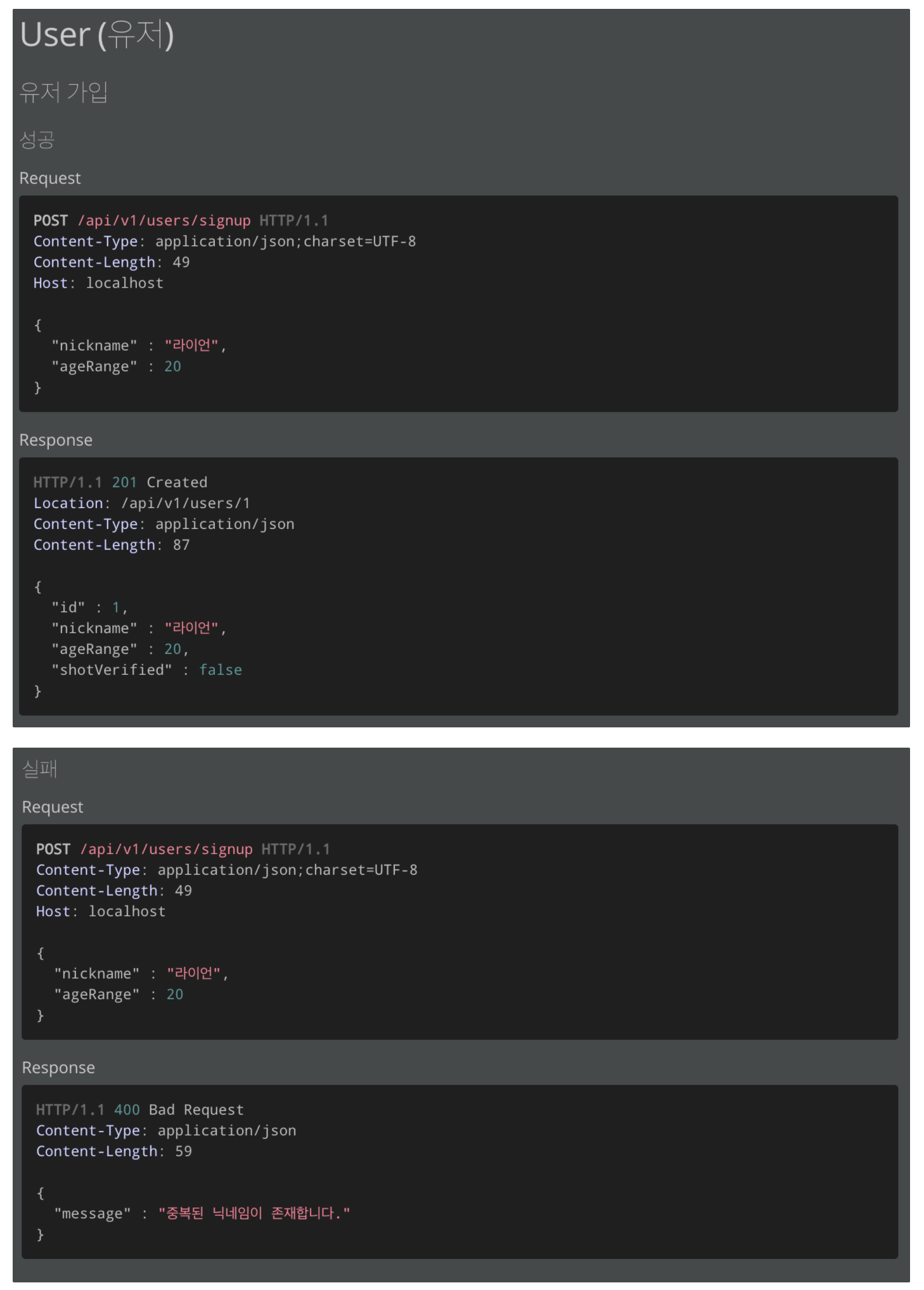 ifndef::snippets[] :snippets: ../../../build/generated-snippets endif::[] :doctype: book :icons: font :source-highlighter: highlightjs :toc: left :toclevels: 2 :author: Team CVI :email: https://github.com/woowacourse-teams/2021-cvi // 여기까진 설정 부분 == User (유저) === 유저 가입 ==== 성공 ===== Request include::{snippets}/user-signup/http-request.adoc[] ===== Response include::{snippets}/user-signup/http-response.adoc[] ==== 실패 ===== Request include::{snippets}/user-signup-failure/http-request.adoc[] ===== Response include::{snippets}/user-signup-failure/http-response.adoc[]